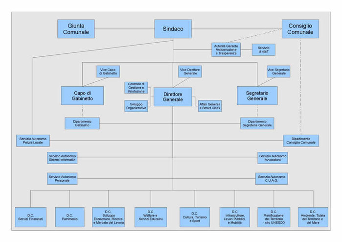 Giunta Comunale Sindaco Consiglio Comunale Capo di Gabinetto Direttore Generale Sviluppo organizzativo Controllo Gestione e Valutazione Vice Capo di Gabinetto vice Direttore Generale vice Segretario Generale vice Direttore Generale Affari Generali e Smat Cities Autorità Garante Anticorruzione e Trasparenza Dipartimento Segreteria Generale Servizio Autonomo Polizia Locale Servizio Autonomo Sistemi Informativi Servizio Autonomo Personale Dipartimento Consiglio Comunale Servizio Autonomo Avvocatura Servizio Autonomo C.U.A.G. D.C. Servizi Finanziari D.C. Patrimonio D.C. sviluppo Economico, Ricerca e Mercato del lavoro D.C.  Welfare e Servizi Educativi D.C.  Cultura, Turismo e Sport D.C.  Infrastrutture, Lavori Pubblici e Mobilità D.C.  Pianificazione del territorio - Sito UNESCO D.C. Ambiente, Tutela del Territorio  e del Mare Servizio di Staff - Autorità garante anticorruzione e trasparenza Segretario Generale Dipartimento Gabinetto Dipartimento Gabinetto
